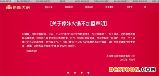 据傣妹火锅2019年在官网发布的声明显示:为保证公司的服务质量和品牌信誉,公司不接受任何形式的加盟、合作,特许经营等申请,也未授权任何网站、企业、个人以公司名义开展合作、加盟等工作。任何以“傣妹”名义公布加盟信息均为假冒。目前该声明依旧在官网置顶公示,同时据官网显示,傣妹火锅在全国已有160家门店。