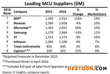 Cypress2016年MCU产品线销售额同比大幅增长,排名也相应上升。未进行大规模收购的MCU厂商则表现平平,只有个位数的增长,比如ST和TI,有的出现了大幅下降,比如Samsung。