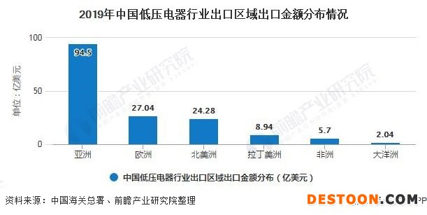 根据中国海关总署公布的数据显示,2019年中国低压电器主要的出口区域为亚洲,出口金额达94.5亿美元,出口欧洲的金额为27.04亿美元,分别占比为58.2%和16.6%。