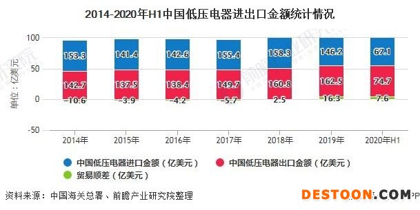 截止至2020年今年上半年中国低压电器进出口总额达到141.8亿美元,同比下降1.6%,降幅比前5个月收窄2.8个百分点。其中,出口金额达到74.7亿美元,同比下降1.9%;进口金额达到67.1亿美元,同比下降1.2%。实现贸易顺差7.6亿美元。