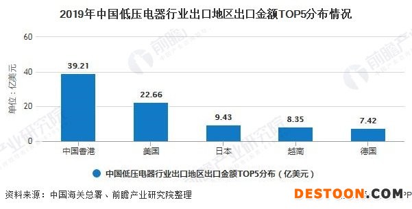 根据中国海关总署公布的数据显示,我国低压电器主要出口市场为中国香港和美国,2019年出口这两个地区的低压电器产品金额分别为39.21亿美元和22.66亿美元。前五大出口地区占出口总额的比重达53.6%。