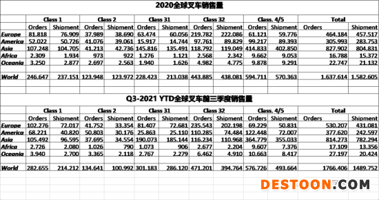 世界工业车辆统计联盟公开了2021年前三季度的全球叉车的统计数据,整体订单1,766,406辆,比去年同期增长54.08%,发货量1,489,752辆,比去年同期增长31.37%,其中积压订单达到276,654辆。再一次显示供应链将是影响未来工业车辆发展的瓶颈。