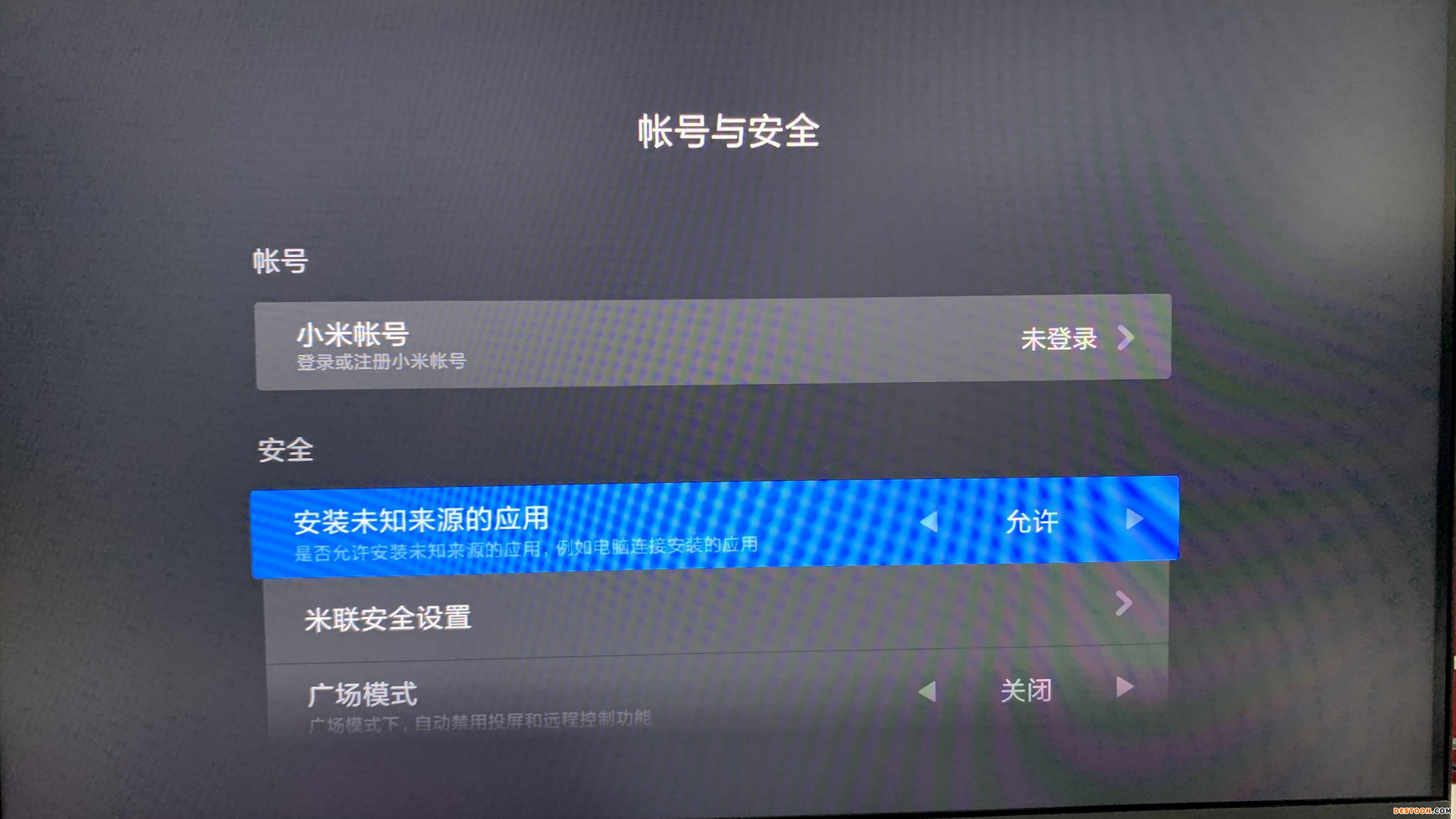 ④如果小米盒子出现下方的提示,则须按下确定键后选择将“安装未知来源的应用”这一栏切换为【允许】后,再次安装软件