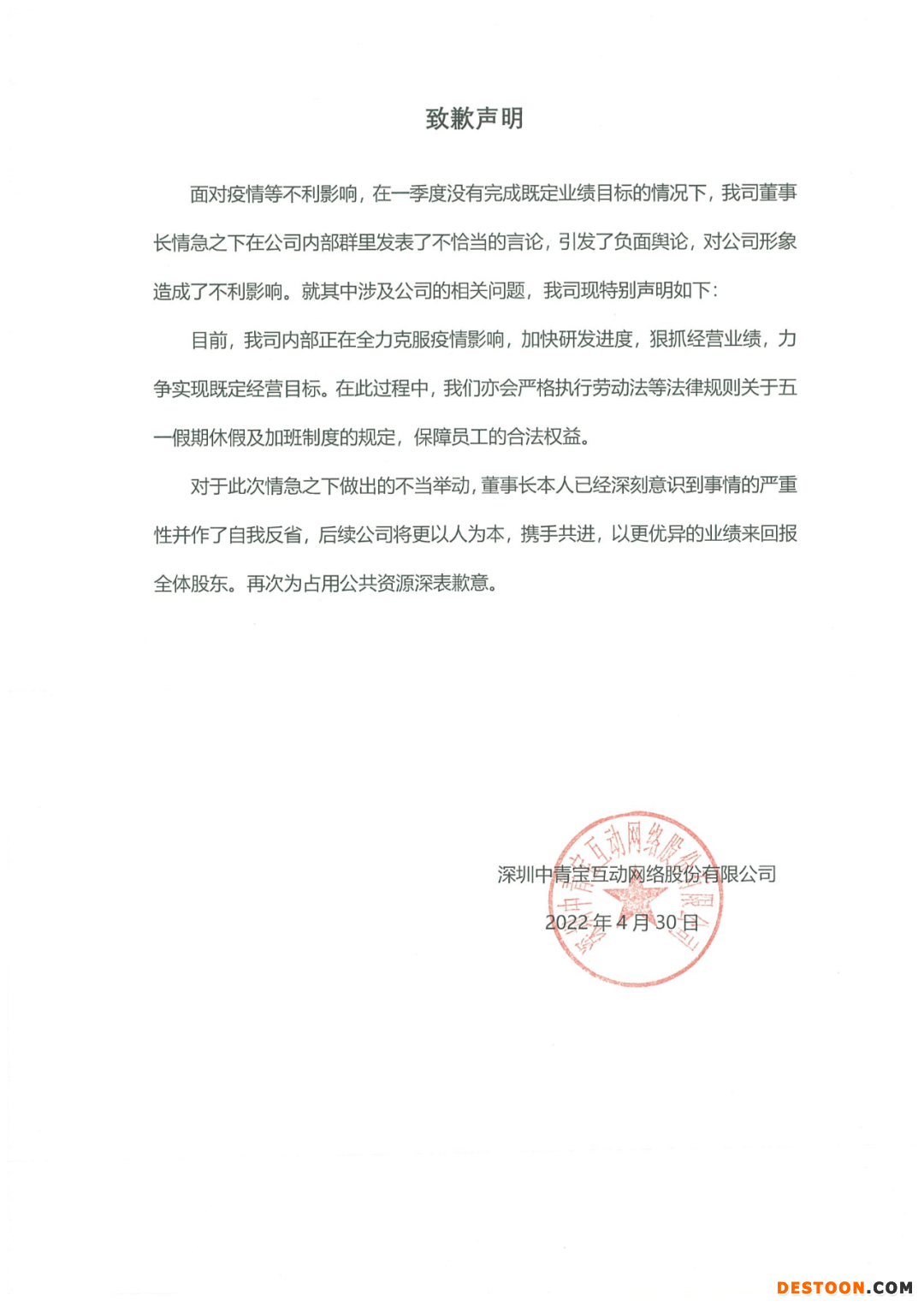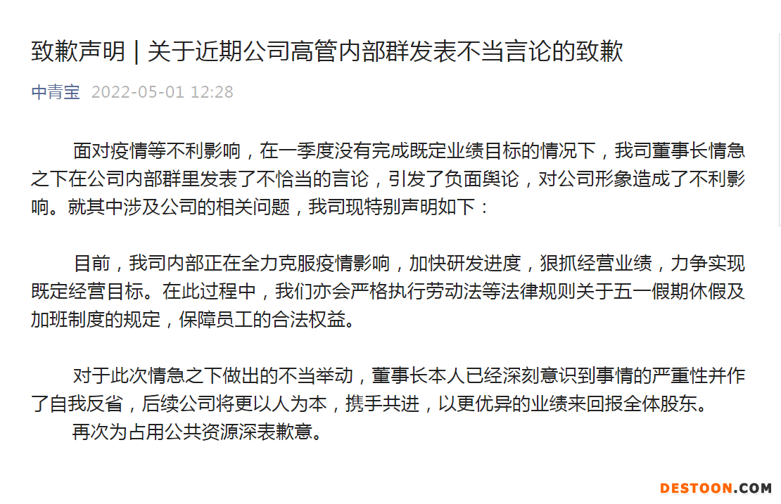 5月1日,中青宝官微就近期公司高管内部群发表不当言论发布致歉声明:目前,我司内部正在全力克服疫情影响,加快研发进度,狠抓经营业绩,力争实现既定经营目标。在此过程中,我们亦会严格执行劳动法等法律规则关于五一假期休假及加班制度的规定,保障员工的合法权益。