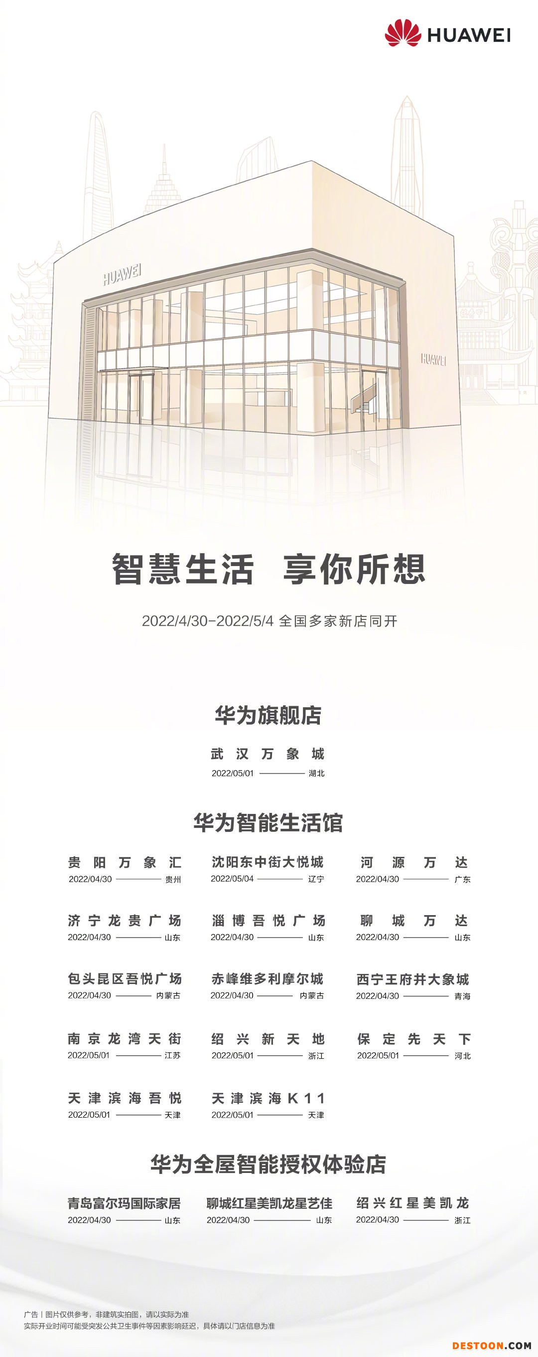 博发布的最新消息,五一劳动节期间,华为多家门店将在全国百花齐放,本次开业门店涉及类型众多,其中华为旗舰店、华为智能生活馆及华为全屋智能授权店将持续为消费者带来智慧全场景生活体验!