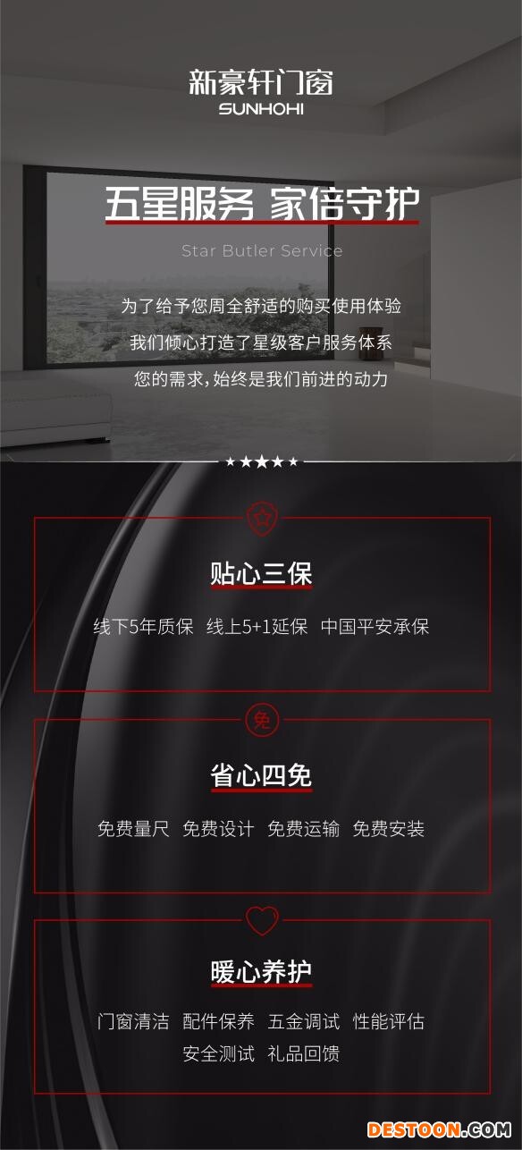 同时,十大门窗品牌新豪轩规范要求安装流程,执着于每处细节,确保每一扇门窗舒适的使用体验。另一方面,新豪轩通过平安保险承保产品责任险,安全升级,守护所有用户的平安。