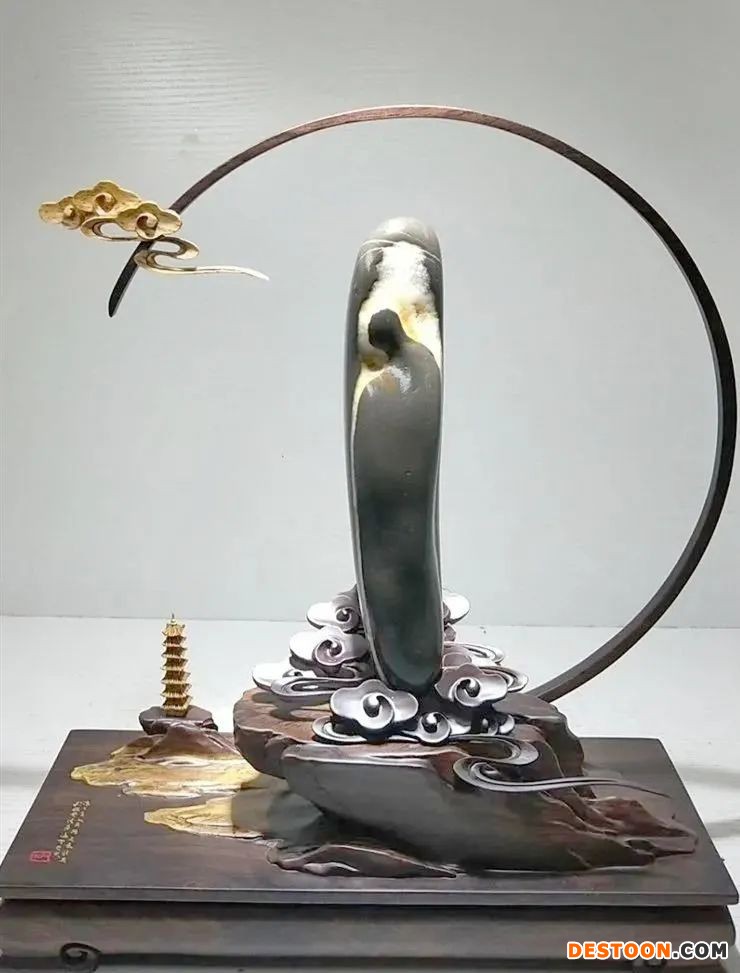 他们还为石头配上造型各异的底座,根据石头的纹理走势,完美契合石头形态。这些底座大多造型古朴,古色古香,有心人还会配上凉亭小景,细节满满。现代赏石则会有一些人为加工的痕迹,但同样精美,巧夺天工。