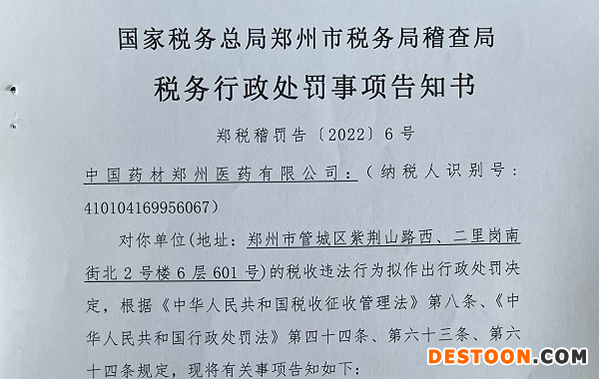 中国网财经4月8日讯(记者 杜丁)日前,国家税务总局郑州市税务局稽查局发布的一则“关于送达中国药材郑州医药有限公司《税务行政处罚事项告知书》”显示,中国药材郑州医药有限公司涉嫌虚开增值税专用发票合计2812份,金额274865613.50元,税额40222253.50元,合计金额达3.15亿元,稽查局拟对该公司处以50万元罚款。