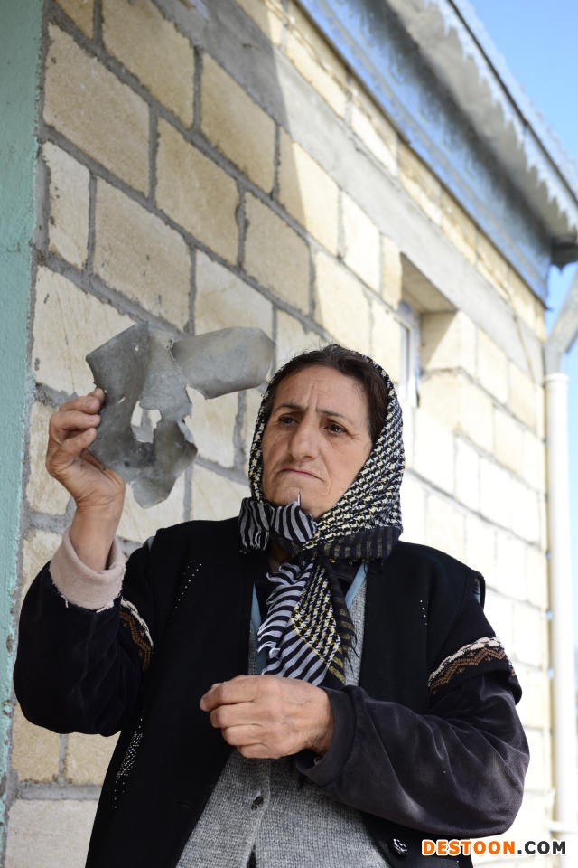 图为在阿塞拜疆境内靠近纳卡地区的格拉戈云鲁村,一名村民向记者展示落在附近的炮弹残片。新华社发(巴巴耶夫摄)