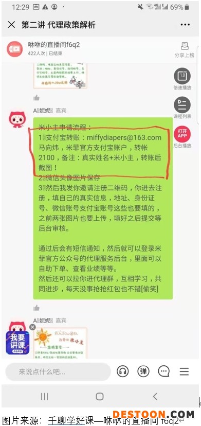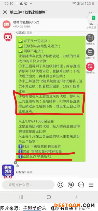 展示巨额收入,是微商们的必要步骤。记者在微信“千聊学好课”平台上,找到了一个“咻咻的直播间”,主播妮妮是一名“米王”代理商,课程中她展示了动辄月入数十万元的代理商收入截图。仇英正是在类似这样的群课或团课中受到了感染。