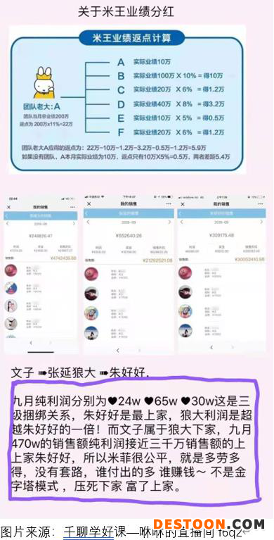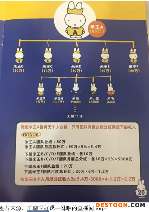 在咻咻直播间的讲课中,妮妮举例:米王A当月无个人业绩,只有团队月度业绩分红的情况下,假设其团队当月完成的总销售额为60万元,按9%的提成比例,团队总分红5.4万元,假设其下属米王B、C、D、E各自旗下团队有10万元销售额,则4位米王按5%提成各分得5000元。再假设A下属的米王F,当月旗下团队完成20万元销售额,则米王F按6%分得1.2万,米王A,则分得扣除B、C、D、E和F业绩奖之后的2万元。