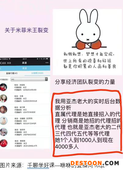 在咻咻直播间中列举的“亚杰老大”的一个例子中,也展现了米菲团队,从团队老大,到直属代理,再到分销商多层级金字塔式的“裂变”模型。