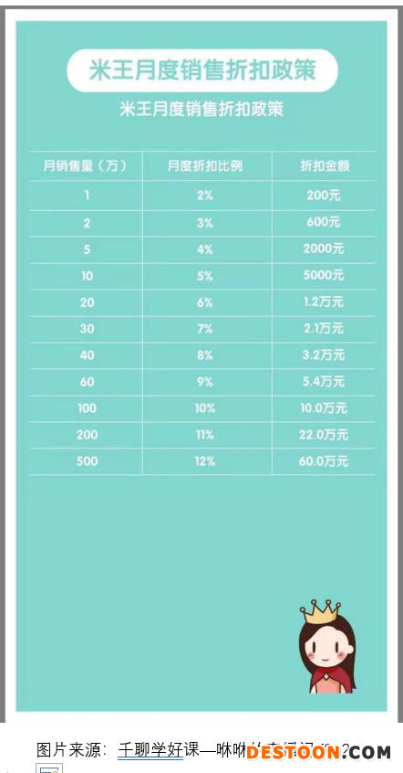 在米菲销售体系中,有一个“业绩返点”或称之为“销售折扣”的概念。所谓业绩返点和销售折扣,就是某个团队共同累计销售的纸尿裤的总金额。当月团队总的销售额从1万到500万,团队可享受2%至12%的提成。