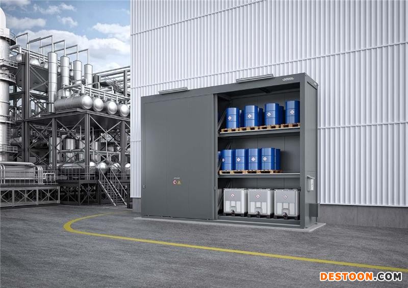 DENIOS中大型危化品耐火存储系统可用于存储甲乙类化学品(闪点≤60℃,如H224/H225或H226级别)、可燃危险废物,用作分装、混料、加热等特殊用途,或用作中转存储和临时存储。