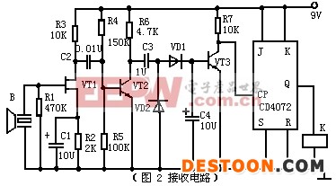 (图2)为接收电路,结型场效应VT1构成高输入阻抗放大器,能够很好地与超声接收器件B相匹配,可获得较高接收灵敏度及选频特性。VT1采用自给偏压方式,改变R3即可改变VT1的表态工作点,超声接收器件B将接收到的超声波转换为相应的电信号,经VT1和VT2两极放大后,再经VD1和VD2进行半波整流变为直流信号,由C3积分后作用于VT3和基极,使VT3由截止变为导通,其集电极输出负脉冲,触发器JK触发D,使其翻转。JK触发器Q端的电平直接驱动继电器K,使K吸合或释放。由继电器K的触点控制电路的开关。