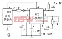 弄清了LM567的基本工作原理和功能后,再来分析图4电路便非常简单了。IC1是红外接收头,它接收发射器发出的红外信号,其中心频率与发射器载波频率f0相同,经IC1解调后,在输出端OUT输出频率为f1的方波信号,也就是与图1中A点波形相同的信号。我们将LM567的中心频率调到与发射器中“与非”门1、2振荡频率相同,即使f2= f1。则当发射器发射信号时,LM567便开始工作,⑧脚由高电平变为低电平,利用这个变化的电平便可去控制各种对象。利用图4的电路,我们可以做成遥控开关,遥控家里的各种家用电器。