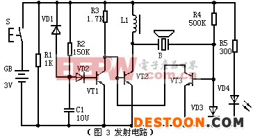 VT2和VT3构成直接耦合正反馈振荡电路,B为40KHz超声发射器件,并兼振荡电路反馈先频元件。因此,此电路可准确地振荡于超声发射器件的中心频率40KHZ。VT1和R2、C1组成500ms延时电路。R1、VD1是C1的放电通路,当按下发射键S时,VT2构成的振荡电路工作,发出超声波,同时,电源通过R2向C1充电,当C1上的电位充到1.4V时(约经过500ms),VT1导通,VT2基极以及VT3集电极电位下降为0.3V左右,振荡器停止工作,当松开发射键S时,C1通过VD1和R1迅速放电,为下一次发射作好准备.VD3和R4构成发射指示电路,当按发射键时,VD3发光。