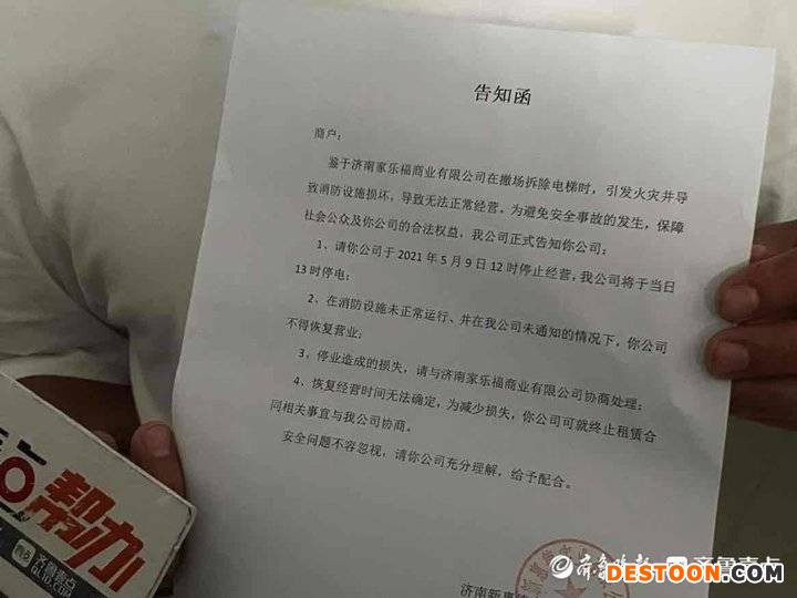 现场的商户向帮办记者出示了济南新惠德实业有限公司下发的告知函。告知函上表示,是因为济南家乐福商业有限公司在撤场拆除电梯时,引发火灾导致消防设施损坏,导致无法正常经营,为了避免安全事故发生,请商户在5月9日12时停止营业,济南新惠德实业有限公司将于当日13时停电。在消防设施未正常运作,并在济南新惠德实业有限公司通知的情况下,各商户不能恢复营业。
