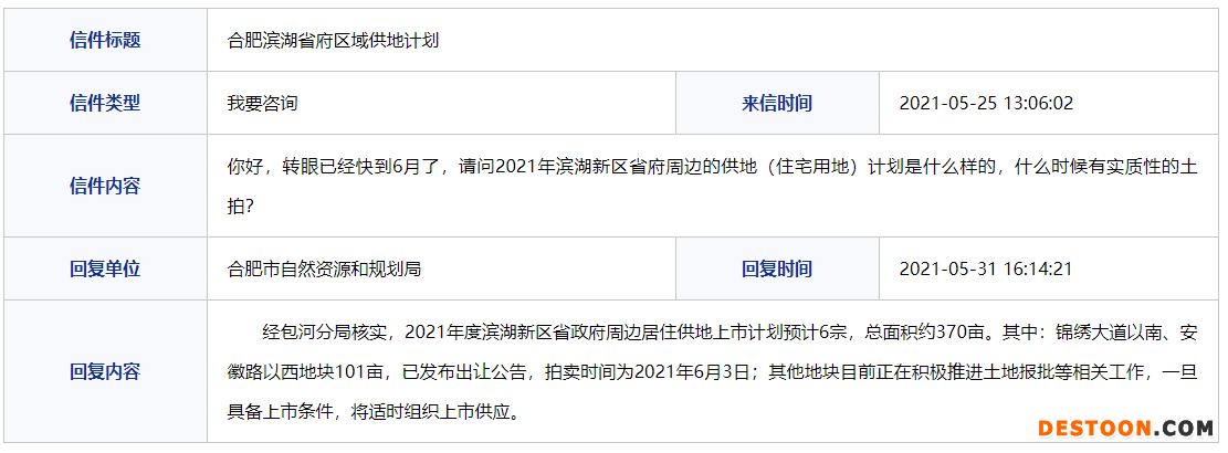 新安晚报 安徽网 大皖新闻讯 近日,有网友在合肥12345政府服务直通车留言:询问2021年滨湖新区省府周边的供地(住宅用地)计划是什么样的,什么时候有实质性的土拍?对此,5月31日,合肥市自然资源和规划局给予回复,具体如下: