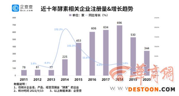 实际上,酵素也不只是食用,还有多种用途,比如化工用途,还有在饲料行业,可以将纤维素等发酵制成饲料等等。来自企查查的数据显示,目前我国“酵素”相关企业现存3012家。从地域分布来看,广东省拥有最多的酵素相关企业,其次是山东、河南等地区。深圳、渭南、临沂是企业量排前3的城市。从企业注册时间来看,2018年是近十年注册量的高峰期,新增696家。近两年注册量呈下跌趋势,今年前8月注册了176家酵素相关企业,同比下跌了19.3%。