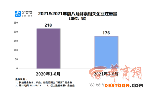 2021年前8月,我国酵素企业注册量为176家,同比下跌了19.3%。从今年的注册趋势来看,今年酵素相关企业的注册量持续呈下跌趋势。