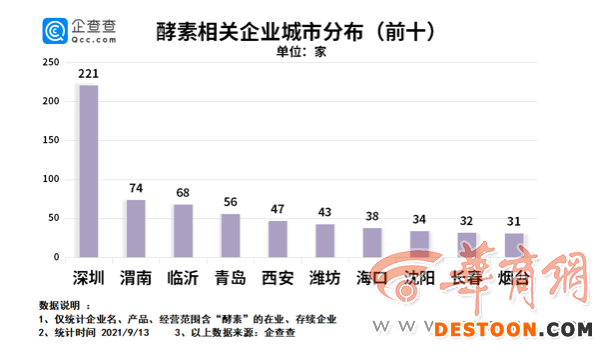 数据显示,我国酵素企业比较多的城市有深圳、渭南、临沂、西安等,这些城市的企业量位居前十之列。