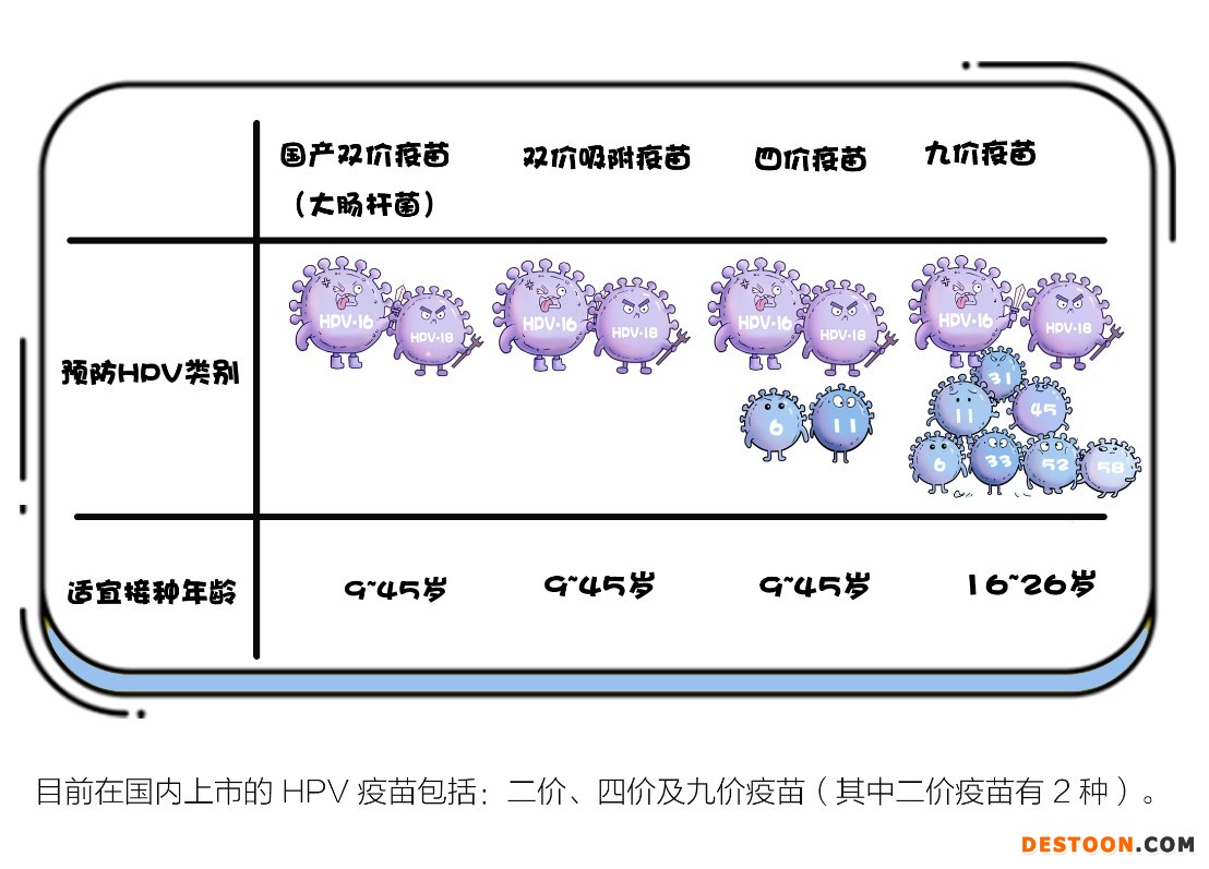 专家介绍,接种HPV疫苗可以预防约70%—90%的宫颈癌。目前,在国内上市的HPV疫苗包括二价、四价及九价疫苗。二价疫苗针对HPV-16和18两种高危型别;四价疫苗在这两者基础上,增加了HPV-6和11两个低危型别;九价疫苗则在四价疫苗基础上多加了5种高危型别HPV,分别是HPV-31、33、45、52、58。四价和九价疫苗适用于9-45岁女性,但九价疫苗仅适用于16-26岁女性。