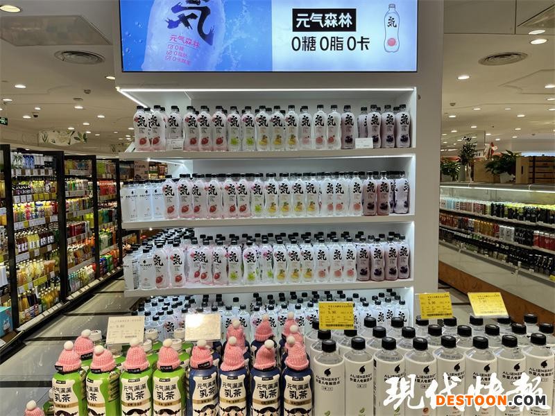 4 月 22 日,在南京新街口一家超市的饮料区域,朝向过道的一整排促销货架,摆满了元气森林的产品,经过的不少客人都会转头看一眼。货架上大部分区域,都是该品牌经典的 0 糖 0 脂 0 卡 气泡水产品,售价 5.5 元。