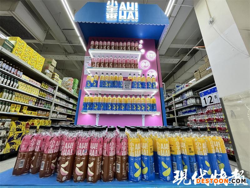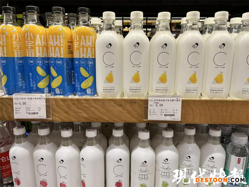 但如果转过这排货架,就可以发现,相似的无糖气泡水,还有很多其他选择。农夫山泉旗下有 4.5 元的苏打天然水,以及售价 5 元、三种口味的苏打气泡水;可口可乐旗下有售价 4.5 元的 小宇宙 AH!HA!,同样有草莓白巧克力、白桃乌龙茶、柚子海盐三种口味;还有新茶饮龙头喜茶旗下的无糖气泡水,有五种口味,售价均为 5.5 元;此外,还有新锐品牌 果子熟了 旗下 东制方造 果味苏打气泡水,同样售价 5.5 元 …… 在另一家大型超市内, 小宇宙 AH!HA! 则占据了大面积的促销 C 位 。