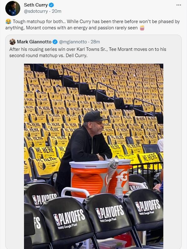 直播吧5月2日讯今天凌晨3点半,勇士将迎来对阵灰熊的季后赛第二轮首战。赛前,记者MarkGiannotto晒出了老库里在灰熊主场等待观战的照片,篮网球员赛斯-库里转推并写道:“