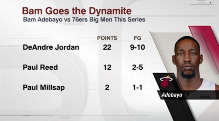 据统计,在热火VS76人系列赛的前两战,阿德巴约在面对76人内线球员的防守时,投篮共计16投12中,得到36分。