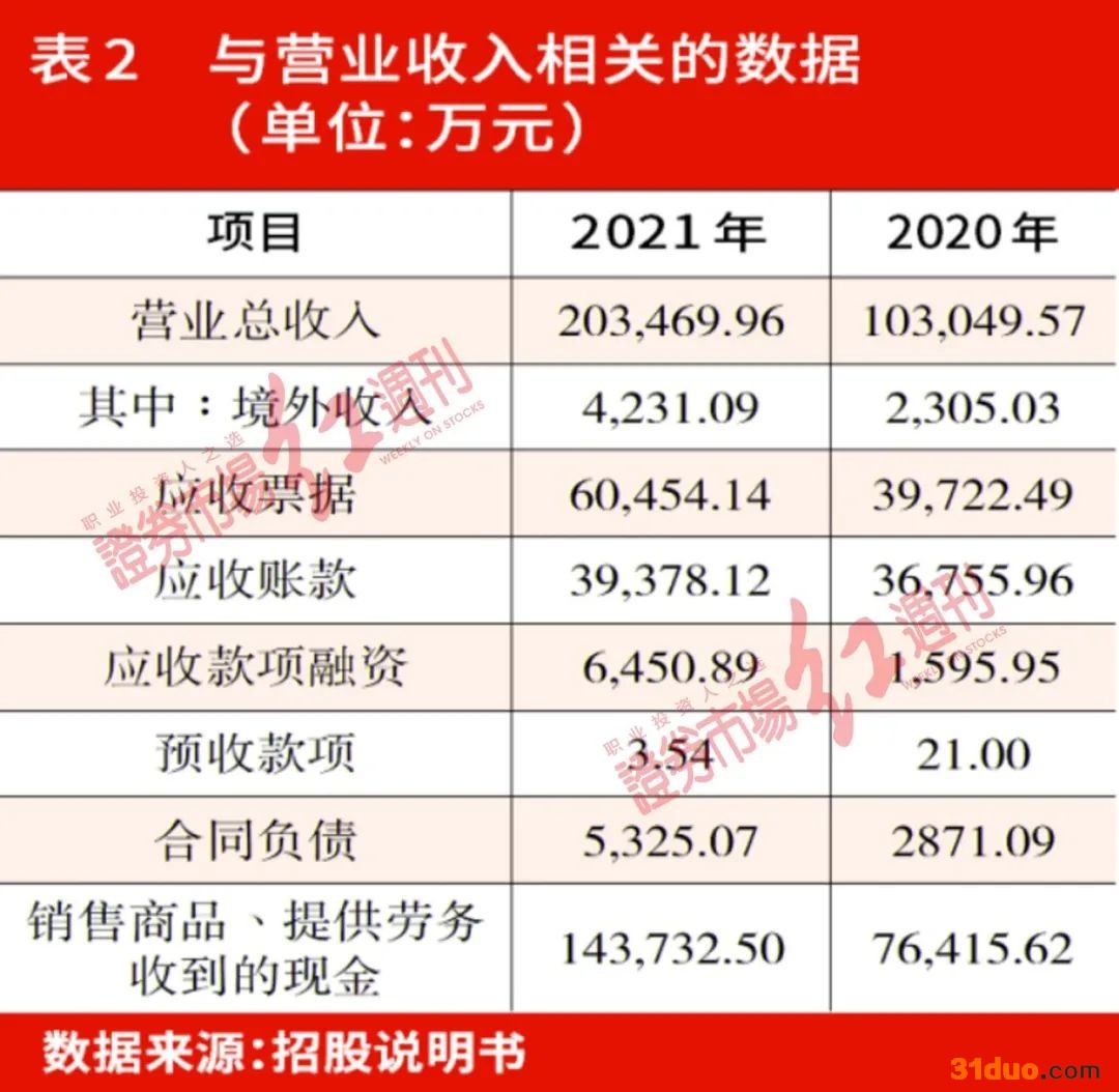 据招股书显示,2021年燕东微实现营业收入金额为20.35亿元,其中,境内收入金额为19.92亿元,境外收入金额为4231.09万元(详见表2)。前者适用的增值税税率为13%,后者适用于免、抵、退税政策,因此可估算出其含税营收金额为22.94亿元。