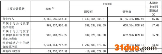 2021年,华创阳安实现营业收入37.66亿元,同比增长15.87%;实现归属于母公司股东的净利润9.68亿元,同比增长47.09%;实现归属于母公司股东的扣除非经常性损益的净利润9.87亿元,同比增长55.93%;经营活动产生的现金流量净额29.34亿元,同比增长63.69%。