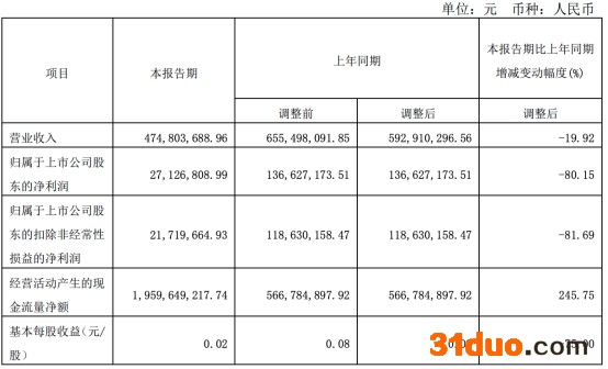 今年一季度,华创阳安实现营业收入4.75亿元,同比减少19.92%;实现归属于上市公司股东的净利润2712.68万元,同比减少80.15%;实现归属于上市公司股东的扣除非经常性损益的净利润2171.97万元,同比减少81.69%;经营活动产生的现金流量净额19.60亿元,同比增长245.75%。