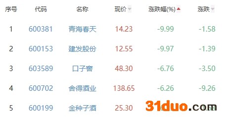 青海春天、建发股份、口子窖、舍得酒业、金种子酒位列涨幅榜后五位,涨幅分别为-9.99%、-9.97%、-6.76%、-6.26%、-6.23%。