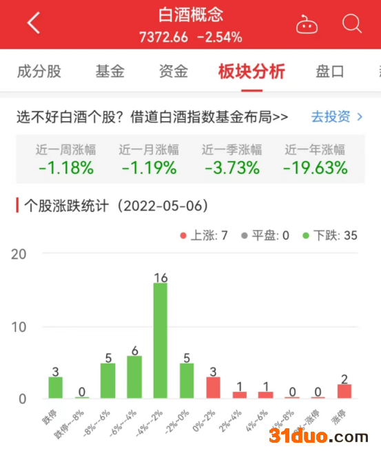 中国经济网北京5月6日讯 今日,白酒概念板块整体跌幅2.54%,其中7只股票上涨,0只股票平盘,35只股票下跌。