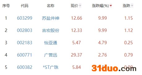 其中,苏盐井神、吉宏股份、怡亚通、广誉远、*ST广珠位列板块涨幅前五位,涨幅分别为9.99%、9.99%、4.79%、2.76%、1.56%。