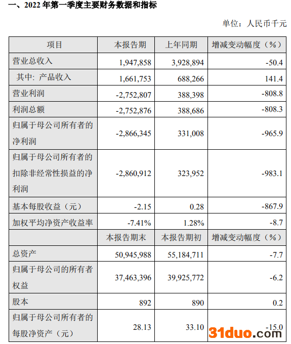5月5日晚间,百济神州(688235.SH)发布2022年一季报,公司实现营业总收入19.48亿元,同比下降50.4%。其中,产品收入16.62亿元,同比上升141.4%;公司实现归属于母公司所有者的净利润亏损28.66亿元,同比减少965.9%。