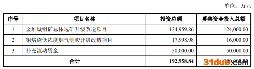 昨日晚间,金钼股份(601958.SH)披露了非公开发行A股股票预案。公司拟募集资金总额预计不超过19亿元,扣除发行费用后的募集资金净额中12.4亿元用于金堆城钼矿总体选矿升级改造项目,1.6亿元用于钼焙烧低浓度烟气制酸升级改造项目,5亿元用于补充流动资金。