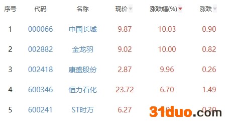 其中,中国长城、金龙羽、康盛股份、恒力石化、ST时万位列板块涨幅前五位,涨幅分别为10.03%、10.00%、9.96%、6.70%、5.03%。