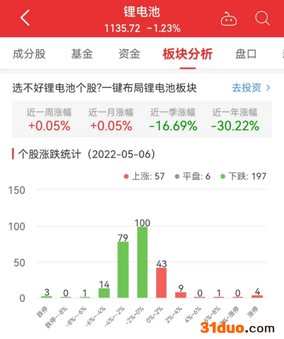 中国经济网北京5月6日讯 今日,锂电池板块整体跌幅1.23%,其中57只股票上涨,6只股票平盘,197只股票下跌。