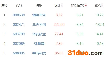 铜陵有色、北方华创、华友钴业、ST新海、容百科技位列涨幅榜后五位,涨幅分别为-6.21%、-5.54%、-5.39%、-5.16%、-5.04%。