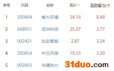 其中,南大环境、佳华科技、达实智能、中兰环保、华通热力位列板块涨幅前五位,涨幅分别为8.48%、3.77%、3.24%、3.20%、3.20%。