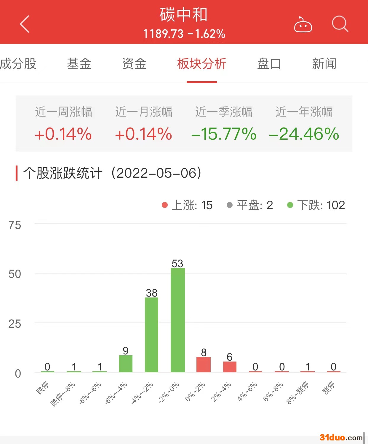 中国经济网北京5月6日讯 今日,碳中和板块整体跌幅1.62%,其中15只股票上涨,2只股票平盘,102只股票下跌。
