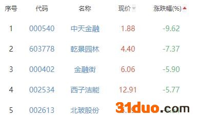 中天金融、乾景园林、金融街、西子洁能、北玻股份位列涨幅榜后五位,涨幅分别为-9.62%、-7.37%、-5.90%、-5.77%、-5.64%。