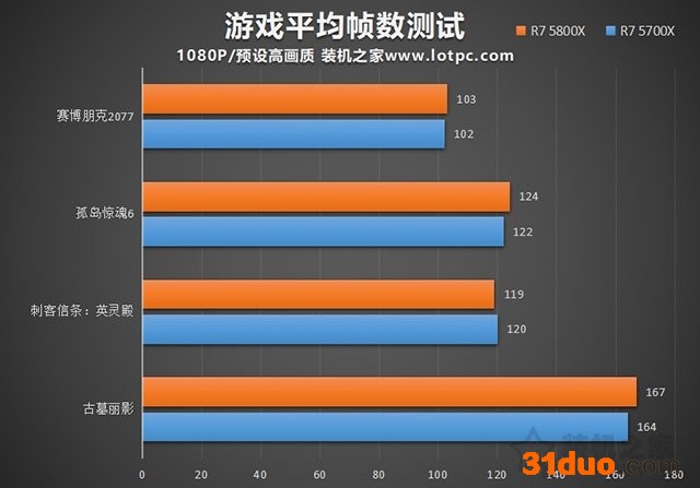 为了反映CPU的真实性能,尽量减少显卡上的瓶颈,测试全部在1080P分辨率进行的,但是画质依然是最高画质,不开光追,不开PBO。游戏选用的分别是《赛博朋克2077》、《孤岛惊魂6》、《刺客信条:英灵殿》以及《古墓丽影》,来看看平均帧数表现吧。