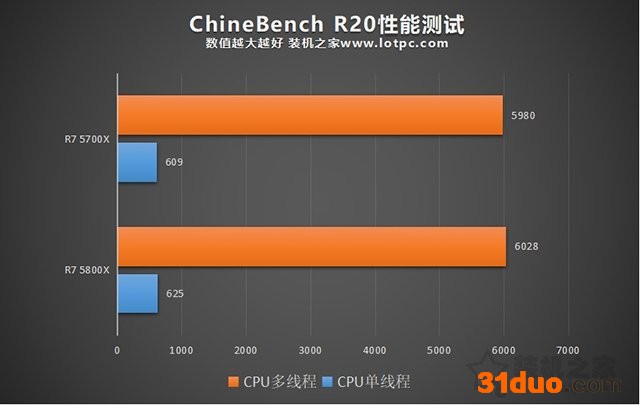 而在ChineBench R20渲染测试中,R7 5700X相比R7 5800X在单核性能落后了2%,多线程性能落后了不足1%,性能差距也不大。