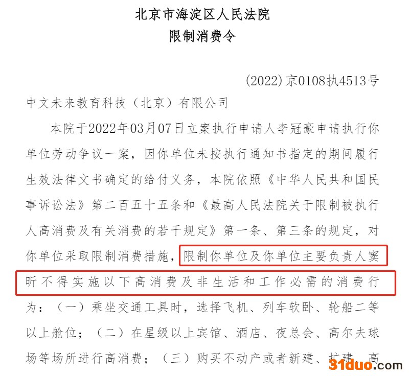 值得一提的是,因中文未来未按执行通知书指定的期间履行生效法律文书确定的给付义务,2022年4月7日,北京市海淀区人民法院发布《限制消费令》,中文未来法定代表人窦昕被限制高消费及非生活和工作必需的消费行为。