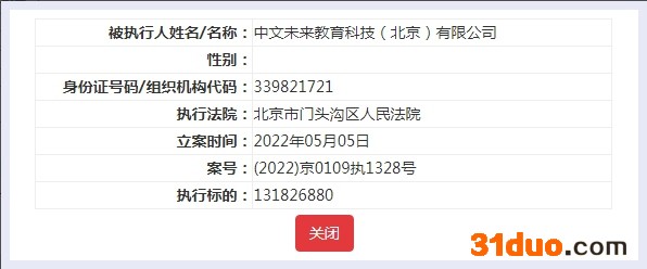 中新经纬5月7日电 中国执行信息公开网信息显示,中文未来教育科技(北京)有限公司(下称“中文未来”)新增一条被执行人信息,执行法院为北京市门头沟区人民法院,执行标的1.32亿元。