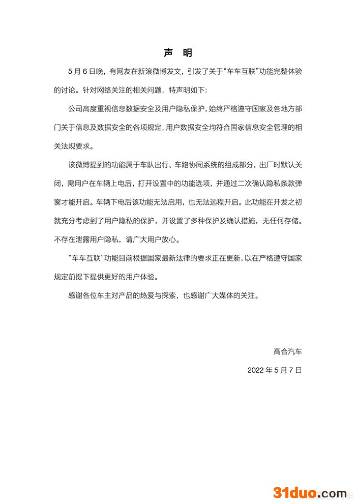 中新财经5月7日电 7日,高合汽车发布声明,回应用户质疑其“车车互联”功能泄露用户隐私问题。